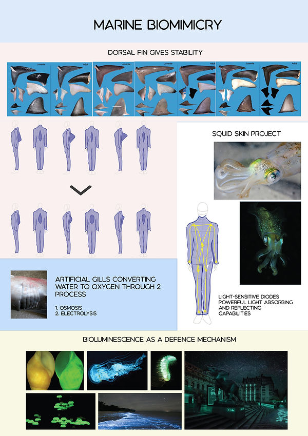 Marine Biomimicry was used in the design; such as borrowing the shape of the shark's fin for its streamline structure, and the application of the concept behind the skin of squids that enables them to camouflage into the surroundings.